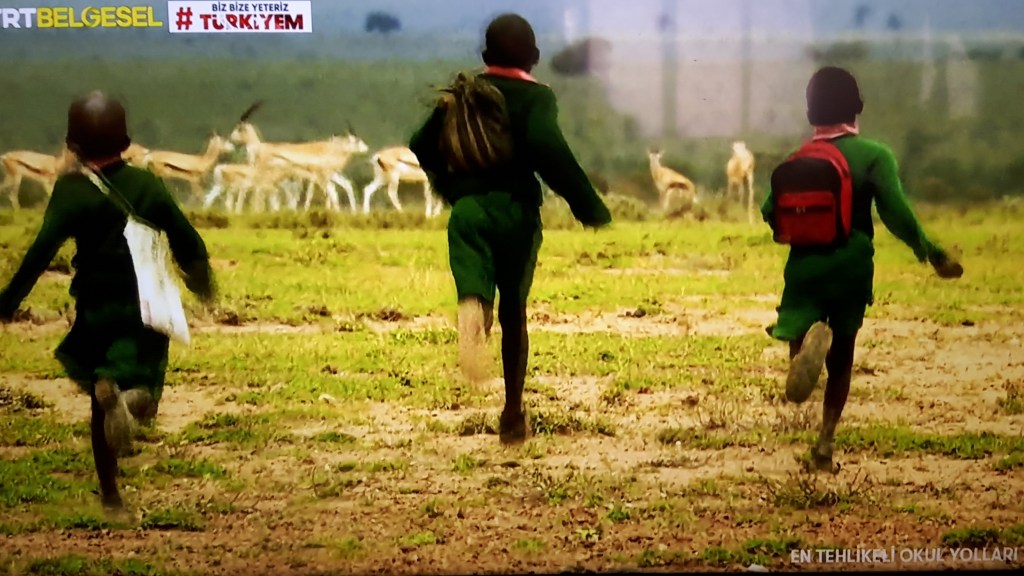 Çocuklar okula kimisi 3 saat kimisi 1 saatte varıyor. Peki bu yollarda nelerle karşılaşıyorlar dersiniz? Filler, leoparlar, yılanlar, zürafalar ve daha neler neler… İzlerken ben o yolda olsaydım ne kadar korkardım ve asla gidemezdim diye düşünüyorsunuz, ister istemez. Aç açına evden çıkan çocuklar yol üstündeki çalılıklardan ve ağaçlardan acımsı meyveleri toplayıp onlardan bir miktar da olsa enerji almaya çalışıyor. Ve yol üzerindeki su kaynağından su içmeden asla geçmiyorlar çünkü okulda su içme şansları yok, dönüşte tekrar içebilecekler…