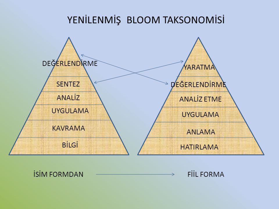 Bloom’ un Taksonomisi’nde eğitim amaçları bilgi, kavrama, uygulama, analiz, sentez ve değerlendirme olarak basamaklanıyor.