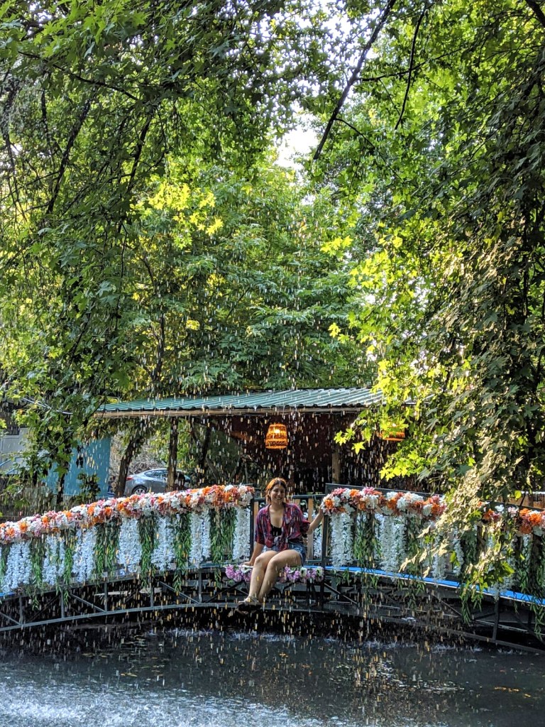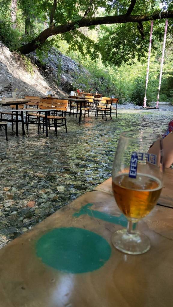 Hem suyun içine hem de üstüne bir köprü yapıp masalar ve oturma yeri yapmışlar. Ahşap ağırlıklı ve yeşillikler içinde gizli bir cennetti. Ben dizaynını beğendim. İnsana epey keyif veriyor, bir de sürekli tepeden damlayan su sesinden meditatif bir ortam oluşmuş. Herkesin dinlenmeye geldiği çok belliydi çünkü insanların yüzünde huzurlu bir ifade vardı… Biz gittiğimizde şansımıza epey tenhaydı.